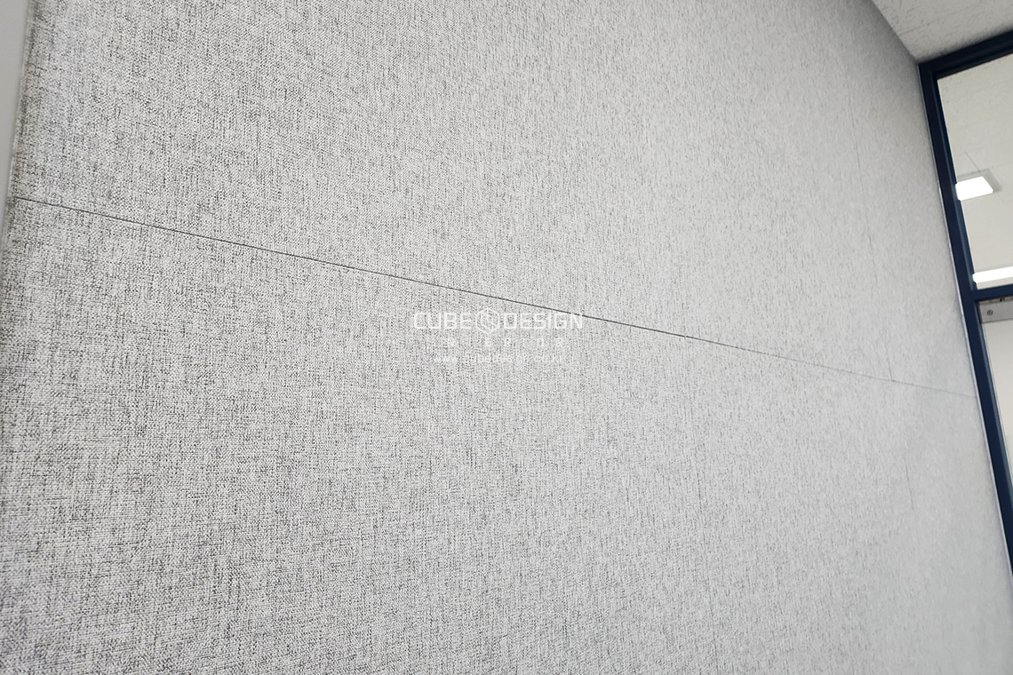 회의실 뒷면은 전면부에 자연스럽게 집중할 수 있도록, 따뜻한 분위기를 제공하는 페브릭 보드로 디자인했습니다.