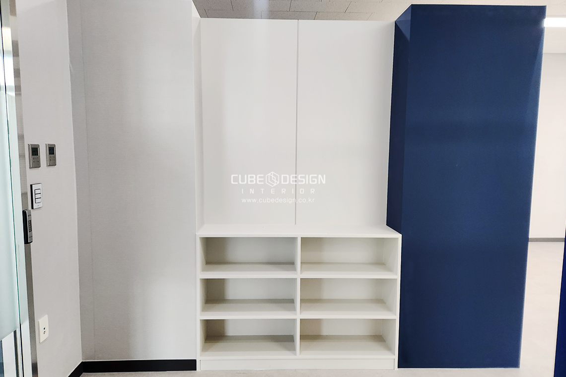 공간 활용도를 높이기 위해 신발장은 사무실 리모델링의 전체 디자인과 조화를 이루는 깔끔한 형태로 제작되었으며,