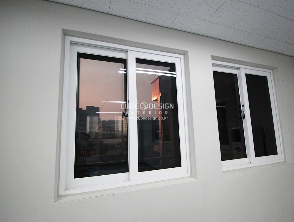 외부 창에는 윈도우 필름과 불투명 시트로 마감.