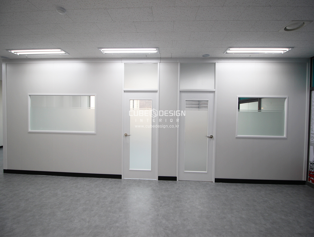 화이트 판넬에 반유리창 및 불투명 시트 마감.