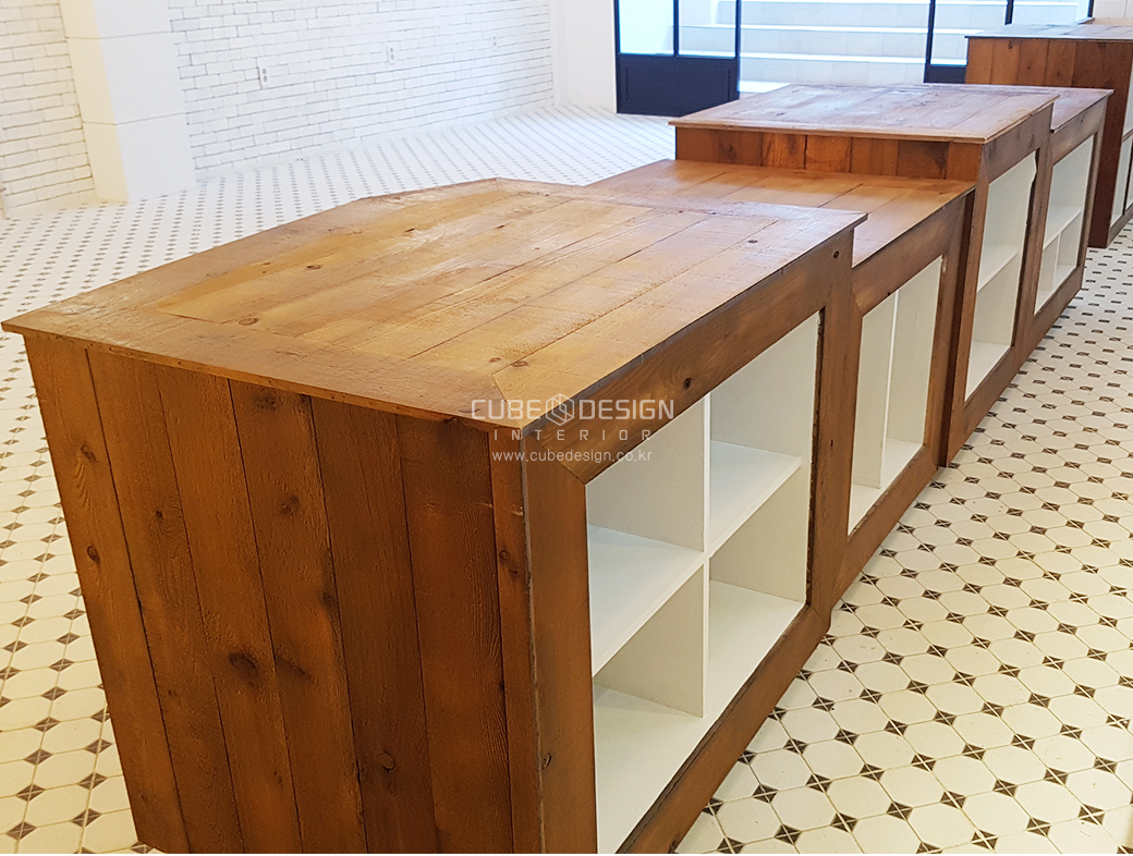 오크소재 고재 진열대를 맞춤 제각 시공했습니다.